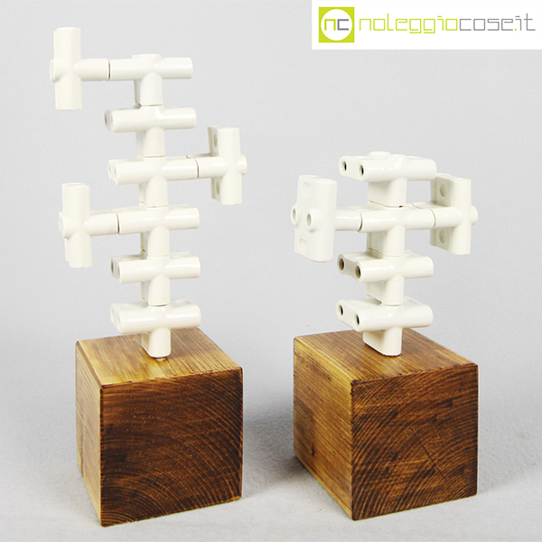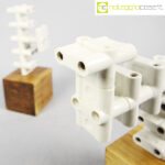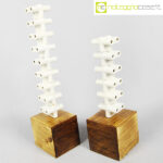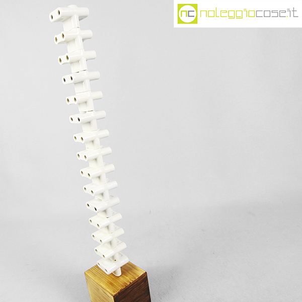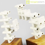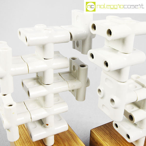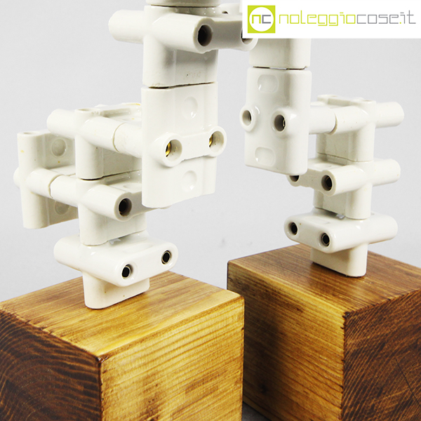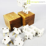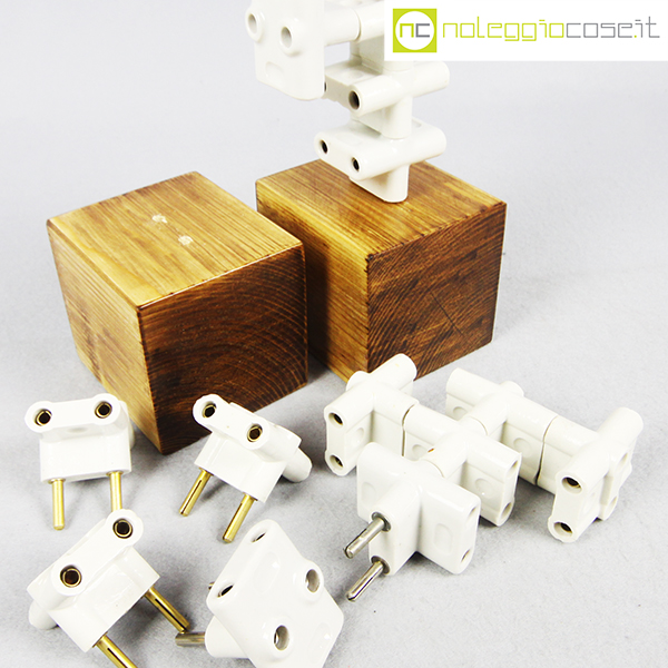 Accumulazione vecchie prese multiple in ceramica, 1930, prese cm 5,5x5x4 cad., base legno cm 10x9x9
