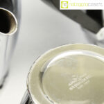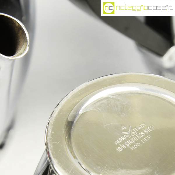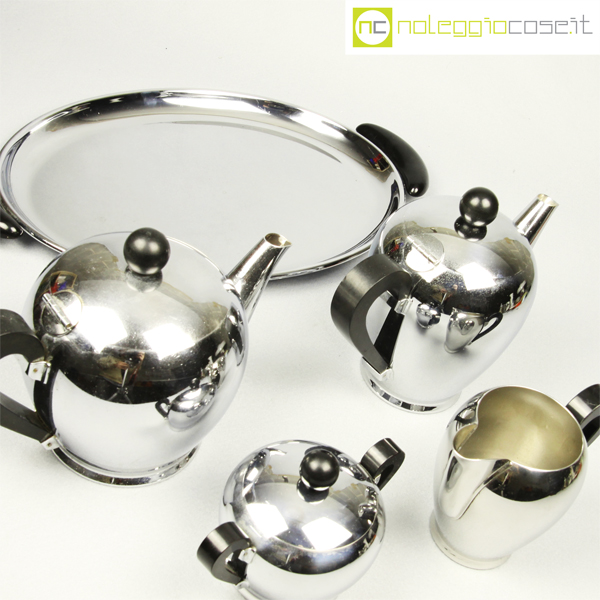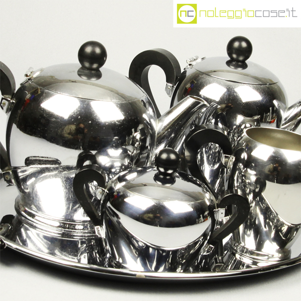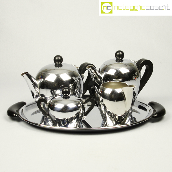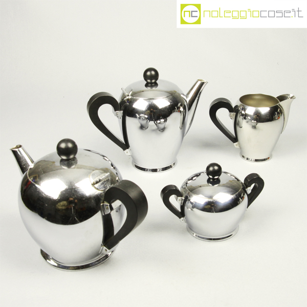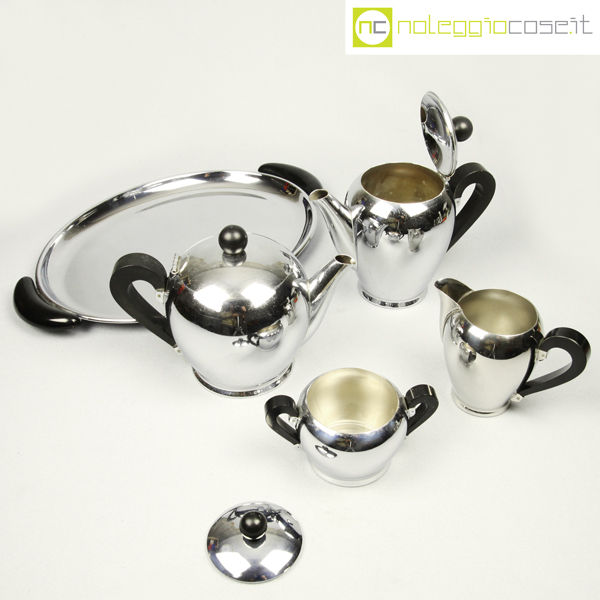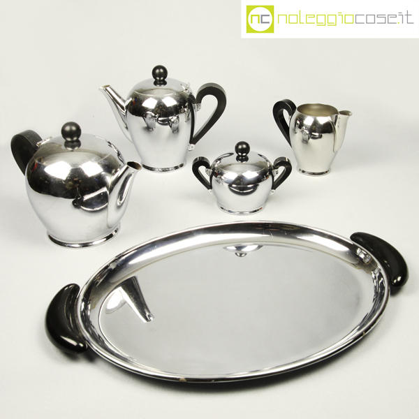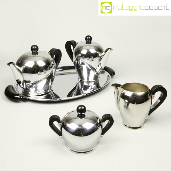 Alfra-Alessi, servizio da tè e caffè Bombè, Carlo Alessi, 1946, vassoio cm 41×27, teiera cm 21x12x15, caffettiera cm 20x10x16, zuccheriera cm 14x9x10, lattiera cm 14x8x11