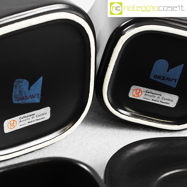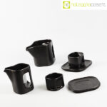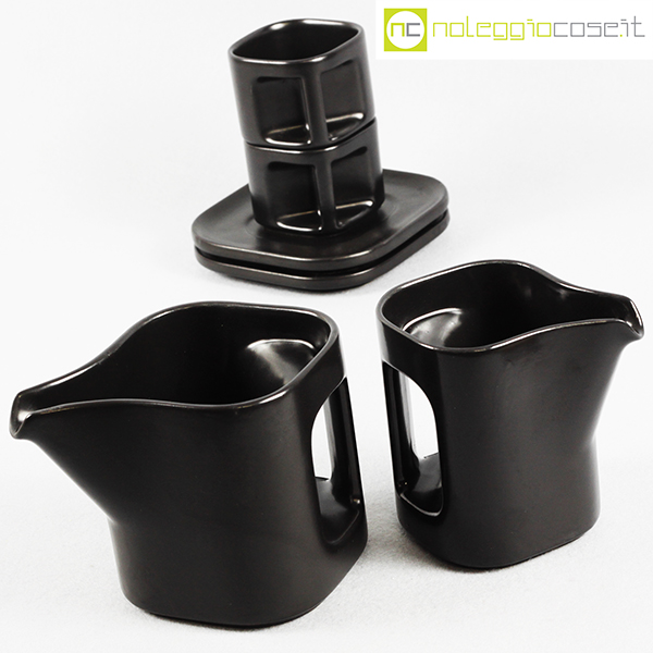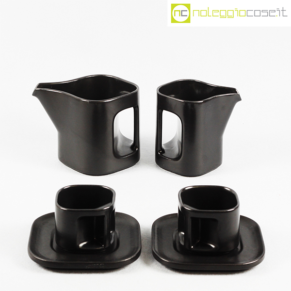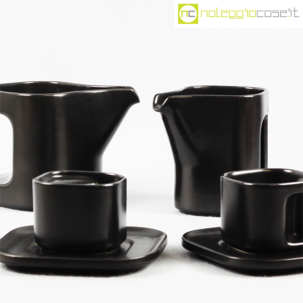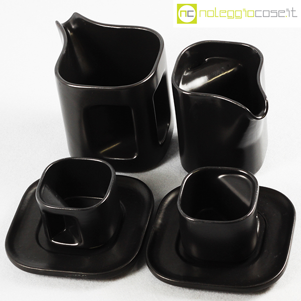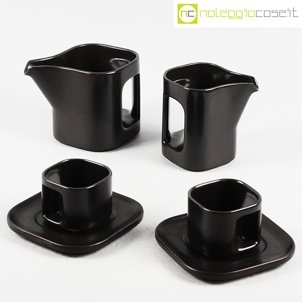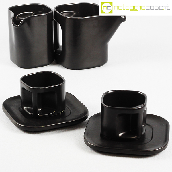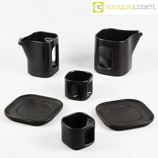 Arnolfo di Cambio, set da tavola serie Square, Makio Hasuike, 1975, bricco grande cm 16×12,5×12, piccolo cm 13x10x12, tazzine cm 7,5×7,5×6, piattini cm 14×14