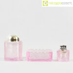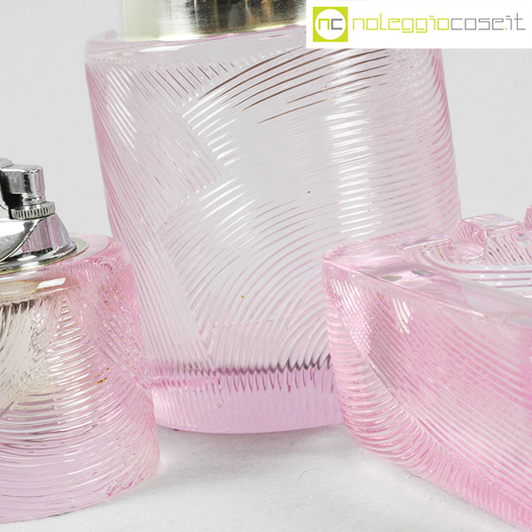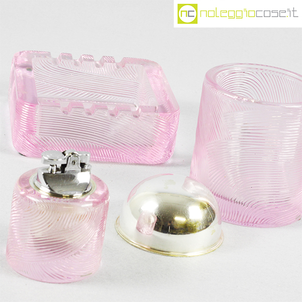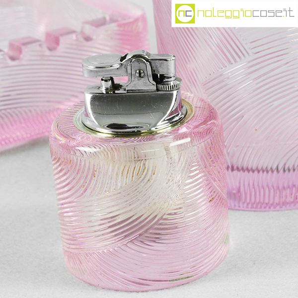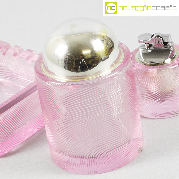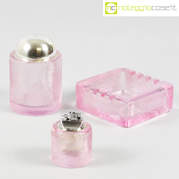 Arnolfo di Cambio, set da fumo in cristallo rosa, Sergio Asti, 1968, posacenere cm 14x14x5,5, barattolo cm 9,5×9,5×14,5, accendino cm 6,5×6,5×8,5