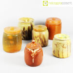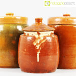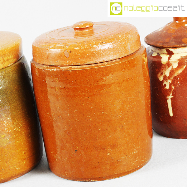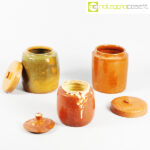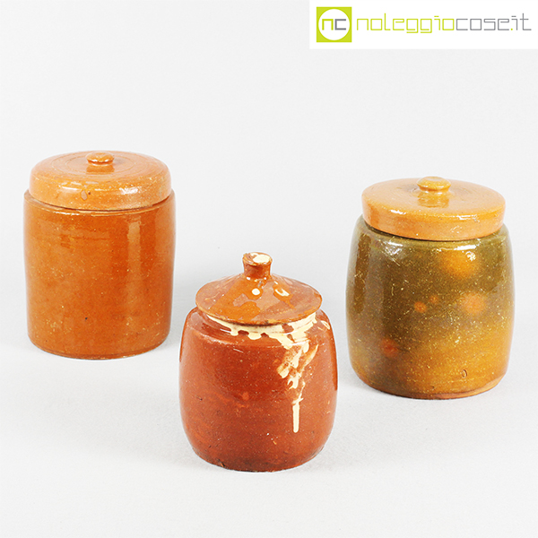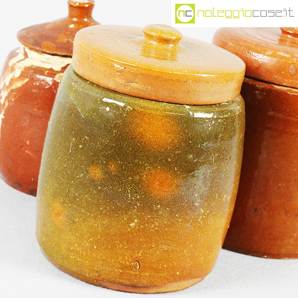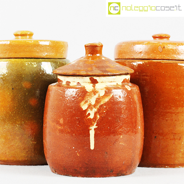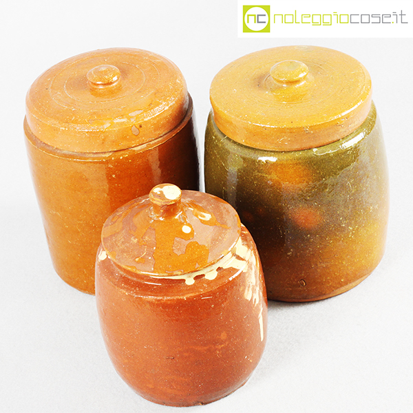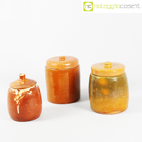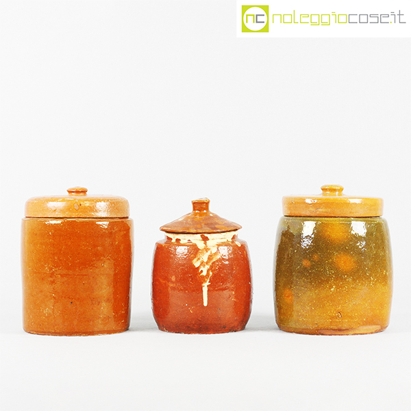 Barattoli per alimenti in ceramica popolare, set 01, fine ‘800, arancio scuro cm 13x13x18, arancio cm 15x15x20, fondo verde cm 15x15x20
