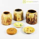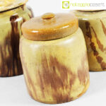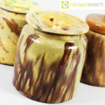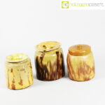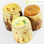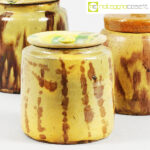 Barattoli per alimenti in ceramica popolare, set 02, fine ‘800, tappo giallo cm 14,5×14,5×15,5, tappo arancio cm 14x14x18, grande cm 16x16x18