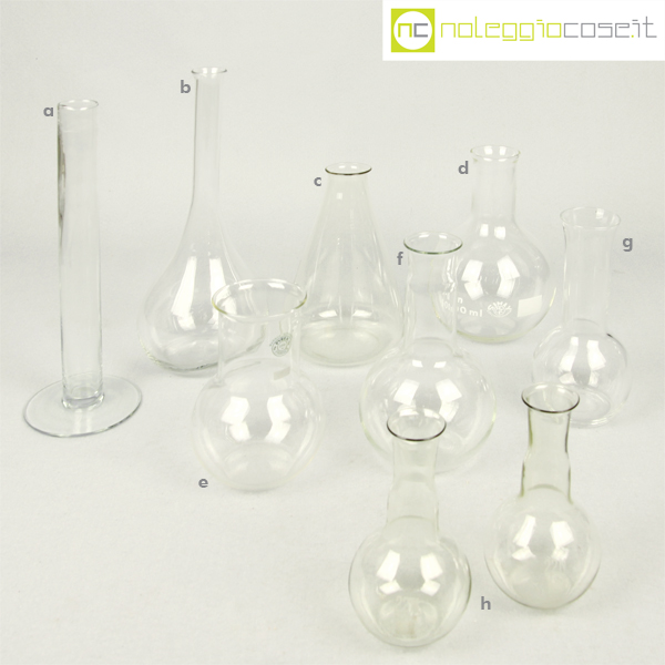 Boccette da laboratorio, a) cm 8x8x24, b) cm 10x10x26, c) cm 10x10x10, d) 10x10x17, e) cm 8x8x12 f) cm 8x8x16, g) cm 6x6x15, h) cm 6x6x12