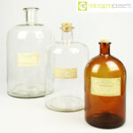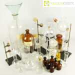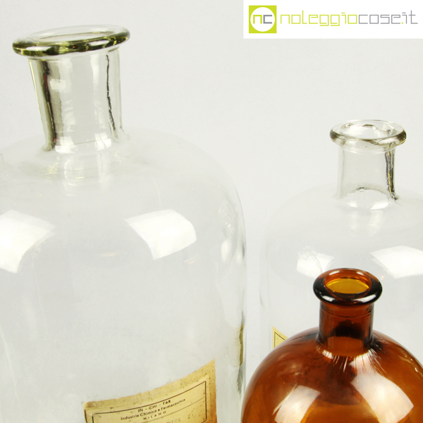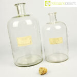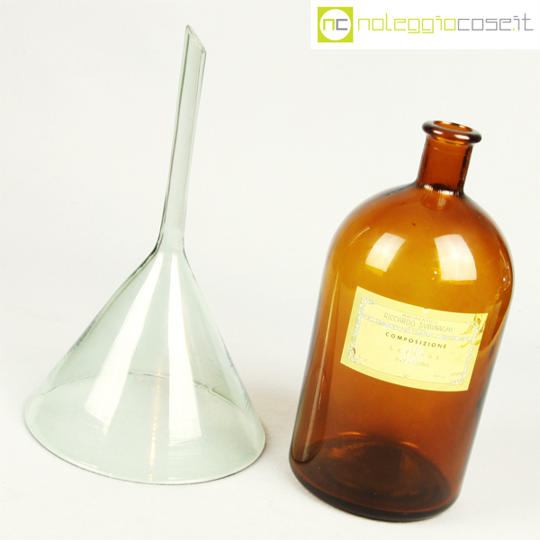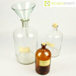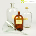 Bottiglie da laboratorio con imbuto, grande cm 21x21x42, media 16x16x33, piccola 13x13x28, imbuto 18x18x30