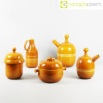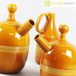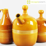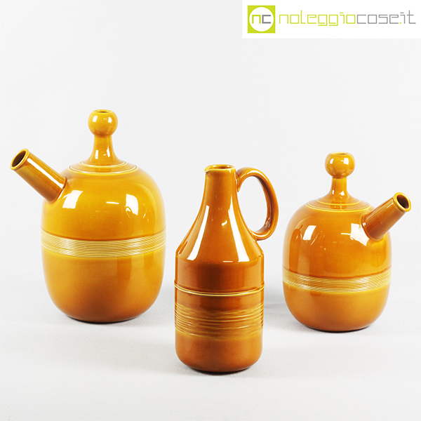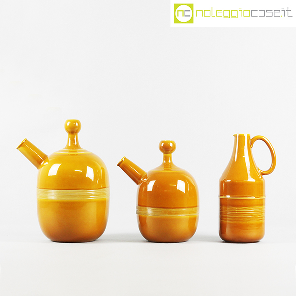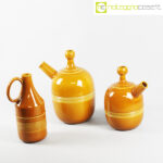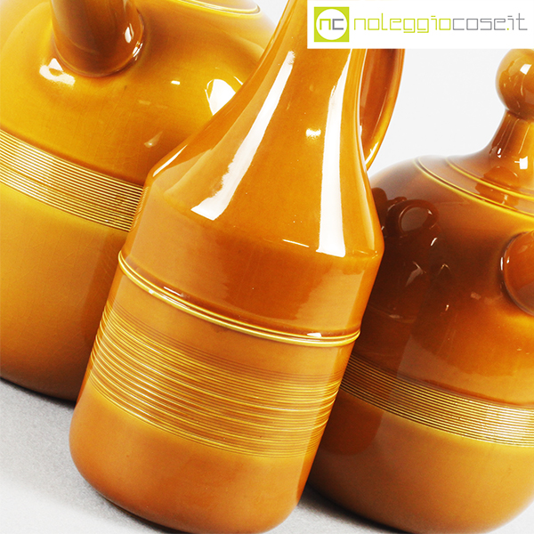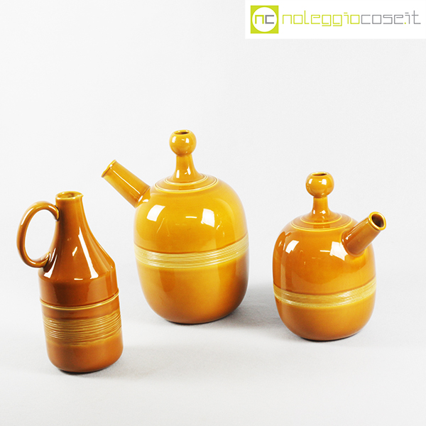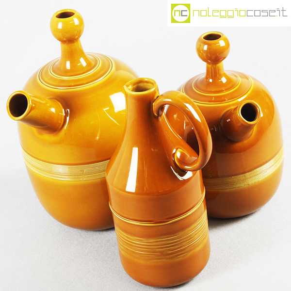 Ceramiche Franco Pozzi, set brocche ocra, Ambrogio Pozzi, 1966, caraffa alta cm 14x11x28, caraffa con becco grande cm 24x18x32, caraffa con becco piccola cm 20x14x25