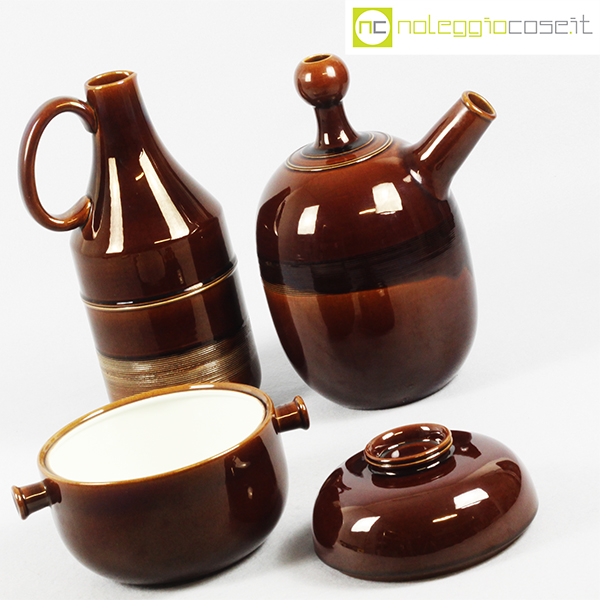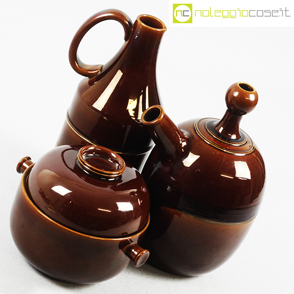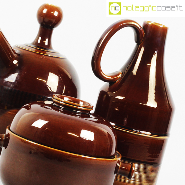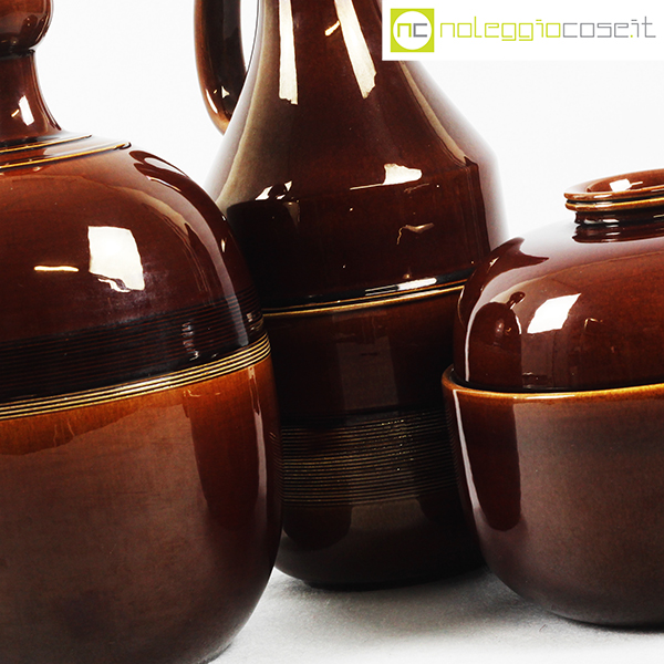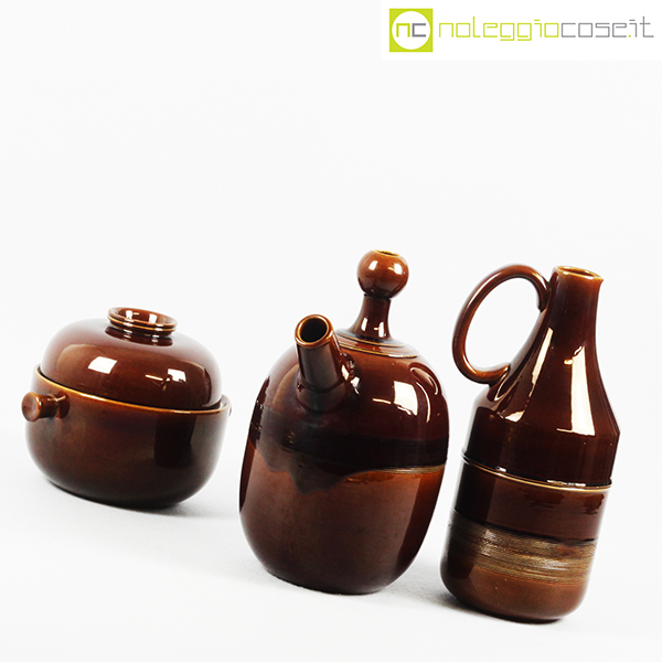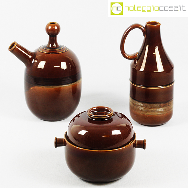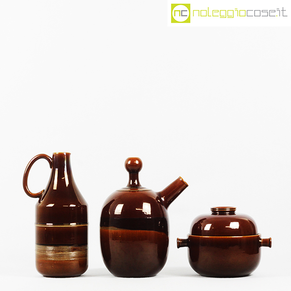 Ceramiche Franco Pozzi, brocche e contenitore marroni, Ambrogio Pozzi, 1966, brocca cm 15x12x26, contenitore cm 21x16x16