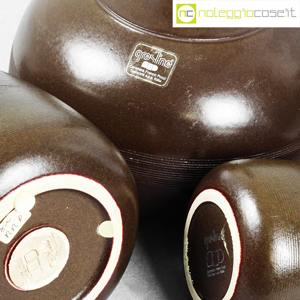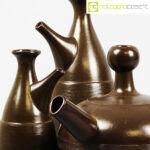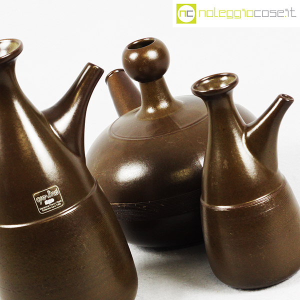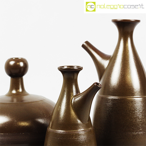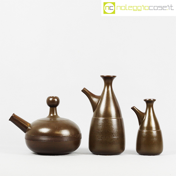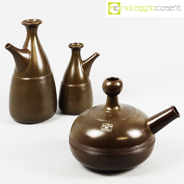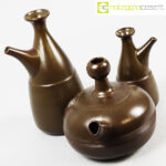 Ceramiche Franco Pozzi, tris brocche marroni, Ambrogio Pozzi, 1966, brocca alta cm 15x12x26, bassa cm 24x18x18, piccola cm 9x9x18