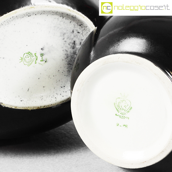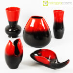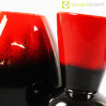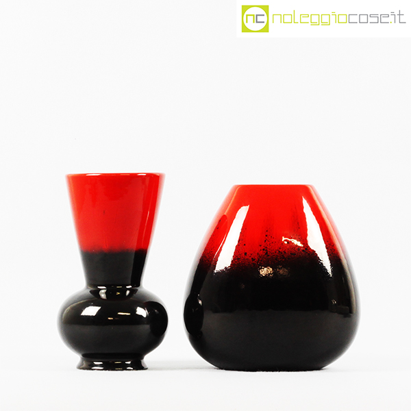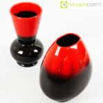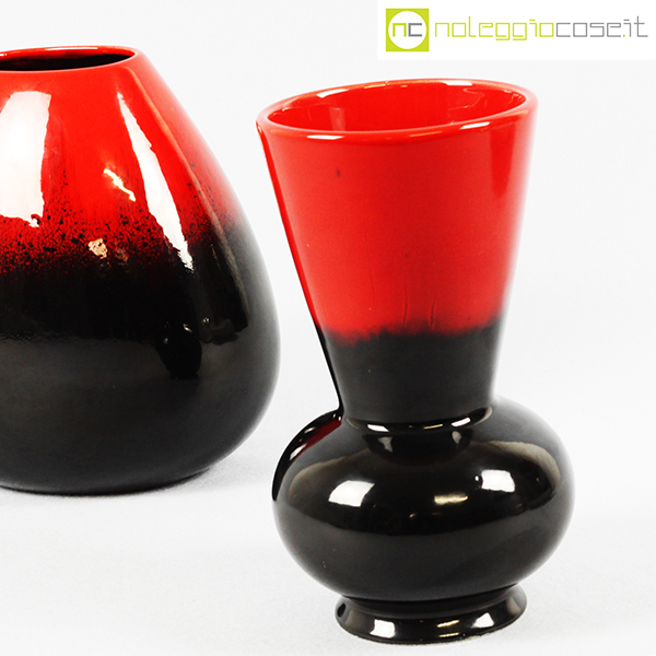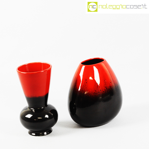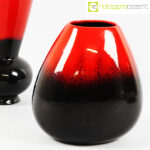 Ceramiche Franco Pozzi, vasi in nero e rosso al selenio, Ambrogio Pozzi, 1953, modello largo cm 19x14x20, modello bocca a cono cm 12x12x21