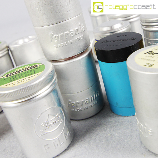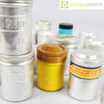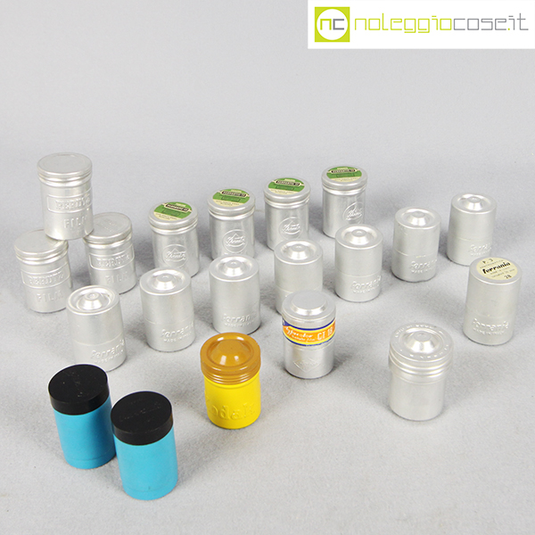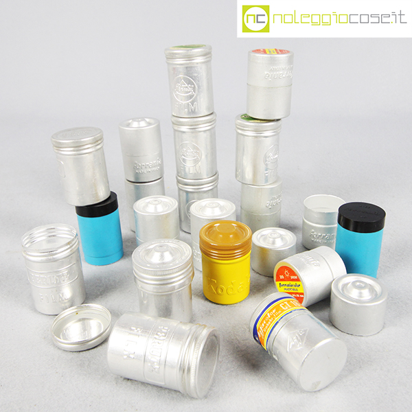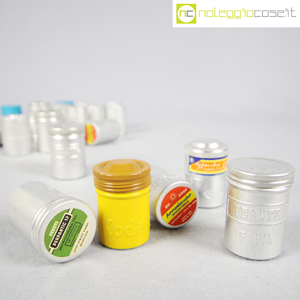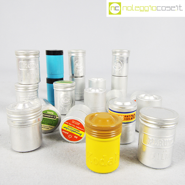 Contenitori per rullini vintage (vuoti), marche varie: Kodak, Ferrania, Agfa, Perutz, cm 3×3 – h 4,5 circa