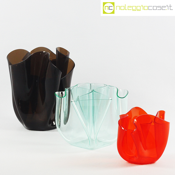 Guzzini, vasi Cartoccio in PMMA, set 01, 1975, fumè cm 22x20x23, trasparente cm 20x20x17, rosso cm 16x14x13