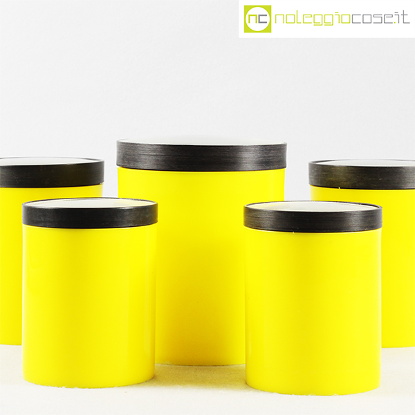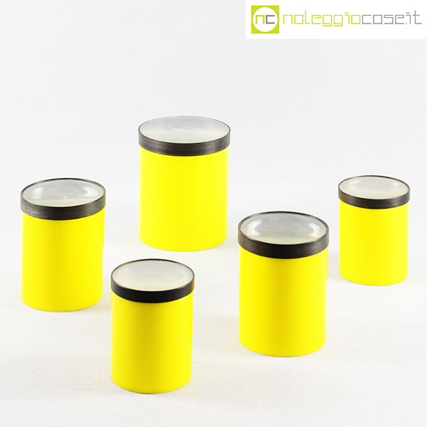 Kartell, barattoli tondi gialli con coperchio a lente, Gino Colombini, 1965, grande cm 12,5×12,5×15, medi cm 10,5×10,5×13,5, piccoli cm 9x9x11,5