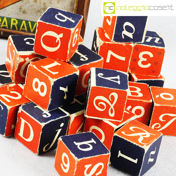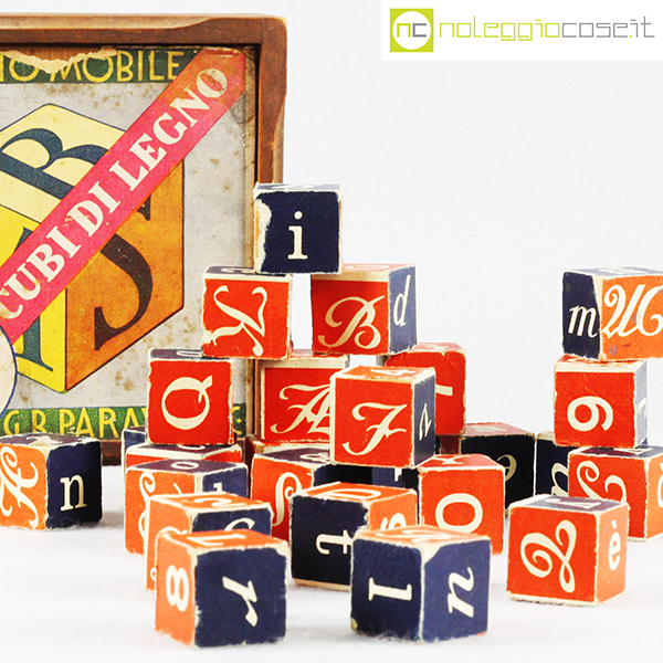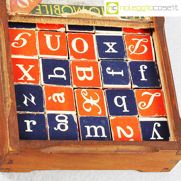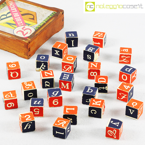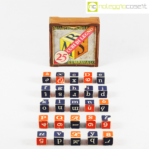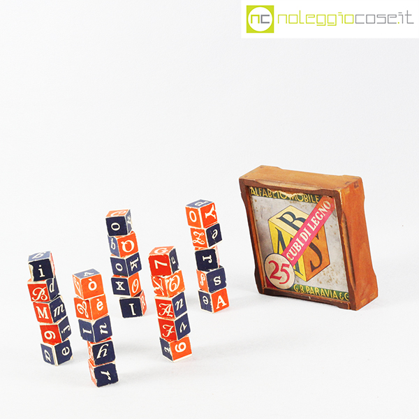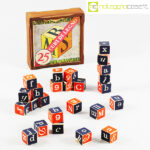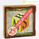 Paravia, alfabeto mobile, cubi in legno, anni ’60, box cm 15x15x4,5, cubi lato cm 2,5