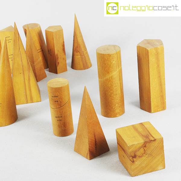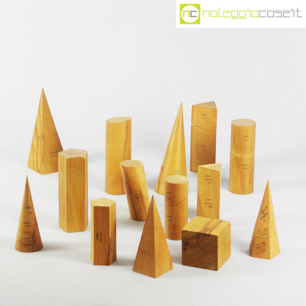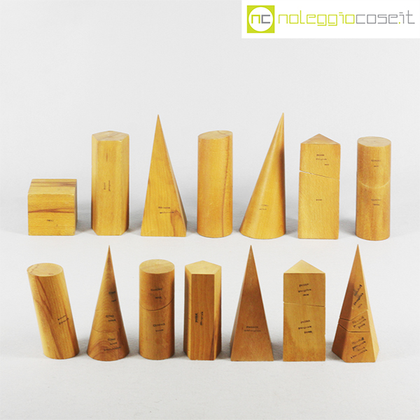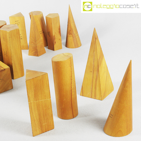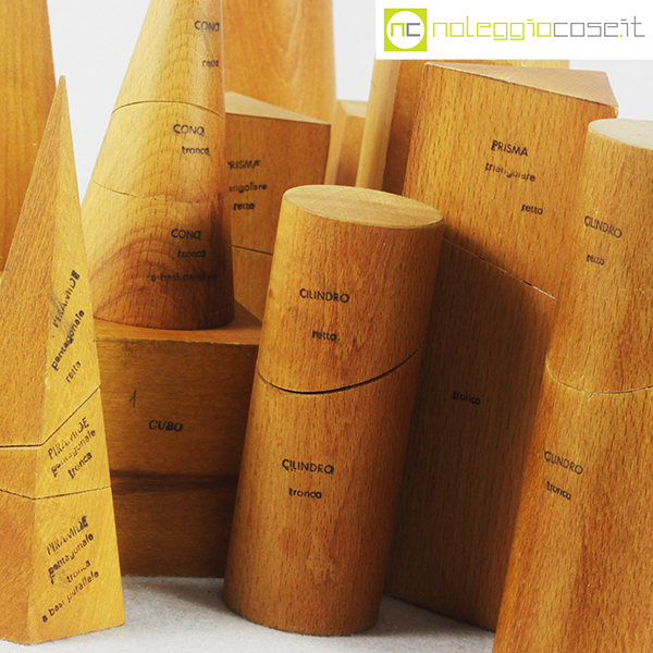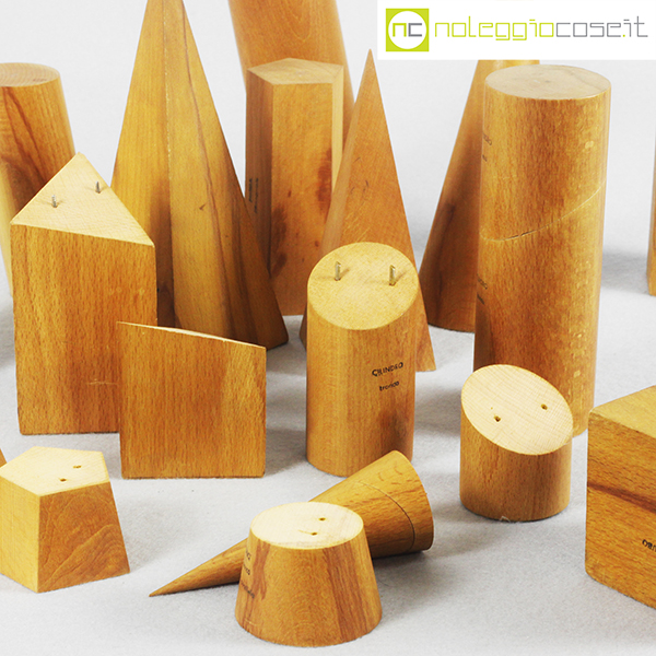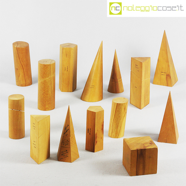 Solidi didattici componibili in legno chiaro, dimensioni varie, altezza da cm 7,5 a cm 20