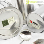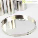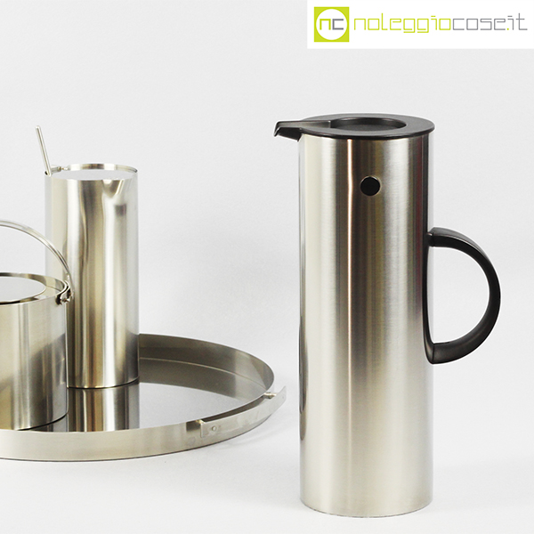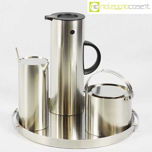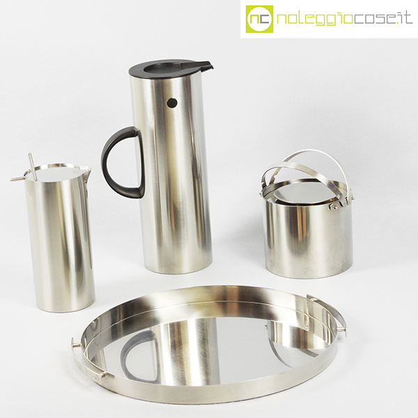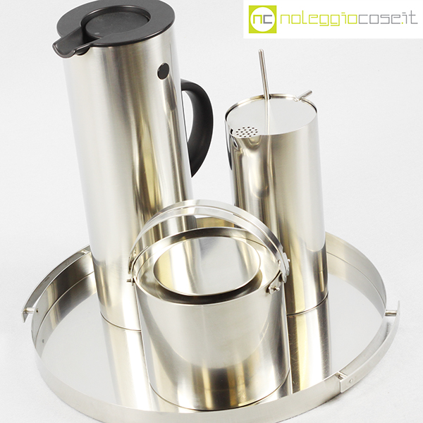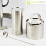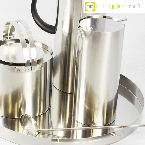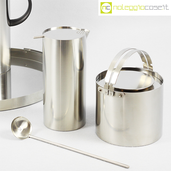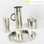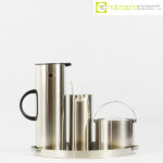 Stelton, set per cocktails serie Cylinda, Erik Magnussen, 1977, vassoio cm 36×33, brocca cm 17×10,5×30, shaker cm 11,5×8,5×19,5, portaghiaccio cm 14,5x13x11